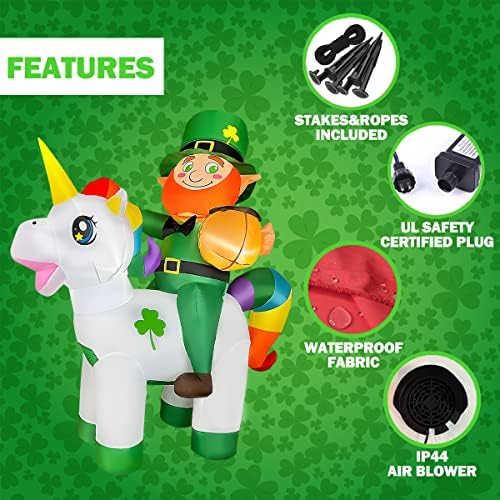 The attention to detail is evident in every aspect of the design, from the buttons on his coat to the buckle on his shoes. The pot of gold at his feet sparkles in the sun, adding a touch of magic to your outdoor space. Whether day or night, this inflatable leprechaun shines bright and adds a touch of whimsy to your St. Patrick’s Day celebrations.