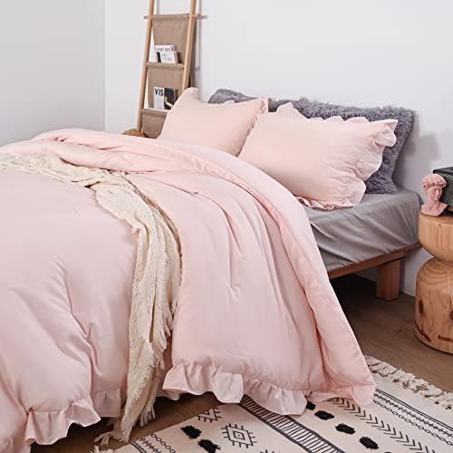 The set includes a comforter and two pillowcases that are designed with ruffled detailing for a classic and elegant look. The comforter is filled with high-quality, down alternative materials that provide warmth without weighing you down.